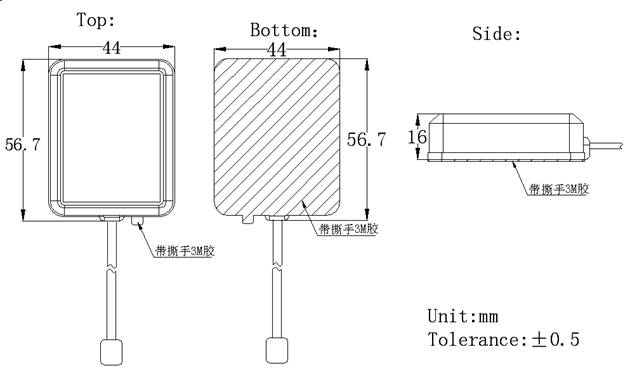 1、北斗車(chē)載導航型天線(xiàn),支持北斗以及GPS頻段,外觀(guān)尺寸:56.7mm×44mm×16mm;